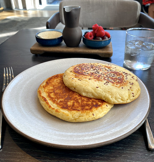 The breakfast The menu reflects Equinox’s health-meets-leisure-meets-sybarite vibe with a choice of pork or turkey bacon and an emphasis on local sourcing. The surprise: just one vegan offering (granola, dried fruits and oat milk). I opted for the flaxseed pancakes, which sounded more dutiful than decadent but were delicious and artfully presented — two plump cakes dusted with flaxseed, nestled on a handsome Jono Pandolfi stoneware plate manufactured across the Hudson in Union City, N.J. Soft, wonderfully spreadable butter accompanied them along with fresh raspberries, blueberries and New York maple syrup, each in its own stoneware container set atop a raw wood tray, like a Japanese still life. The coffee was excellent with refills poured generously. The bill: $30 including tax and tip.