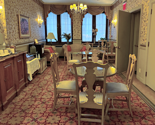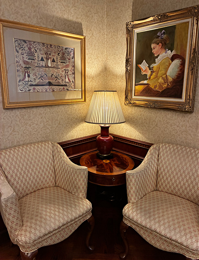 Queen-bed rooms are just about big enough for two people, and the king-bed rooms are spacious – disclaimer coming – by New York standards. I liked the old-style lead-paned windows, dressed with shades and, more conventionally, print curtains with a valence. The bathrooms feature white pedestal sinks and tub/shower combos.