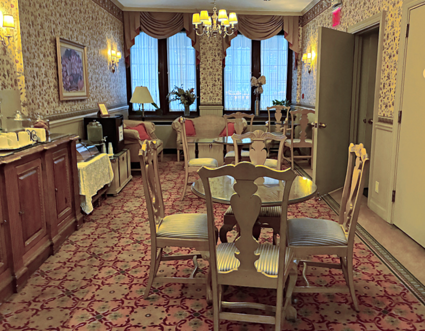 Rooms: Rooms are traditional. Adjectives like clean, homey and pleasant came to mind in the rooms I saw. Consider the wall-mounted wood headboards, white sheets accented with a coppery throw, gold bed skirts, mini-print wallpaper and subtly patterned carpeting. The only overtly granny touch was the elaborate gold-framed mirror.